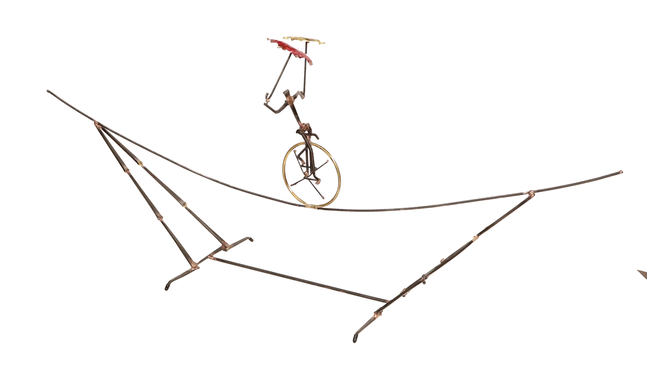 This abstract metal sculpture shows an acrobatic unicyclist carefully maintaining balance with two umbrellas, on a tightrope and with the risk of no net. The fearless rider is crafted with cut steel nails and the unicycle is made from bronze and steel. The umbrellas are copper and brass material. The tightrope and its structure are steel. Steel and bronze welding are the assembly methods used. The base feet are covered with neoprene to prevent display surface scarring.