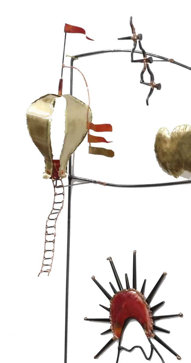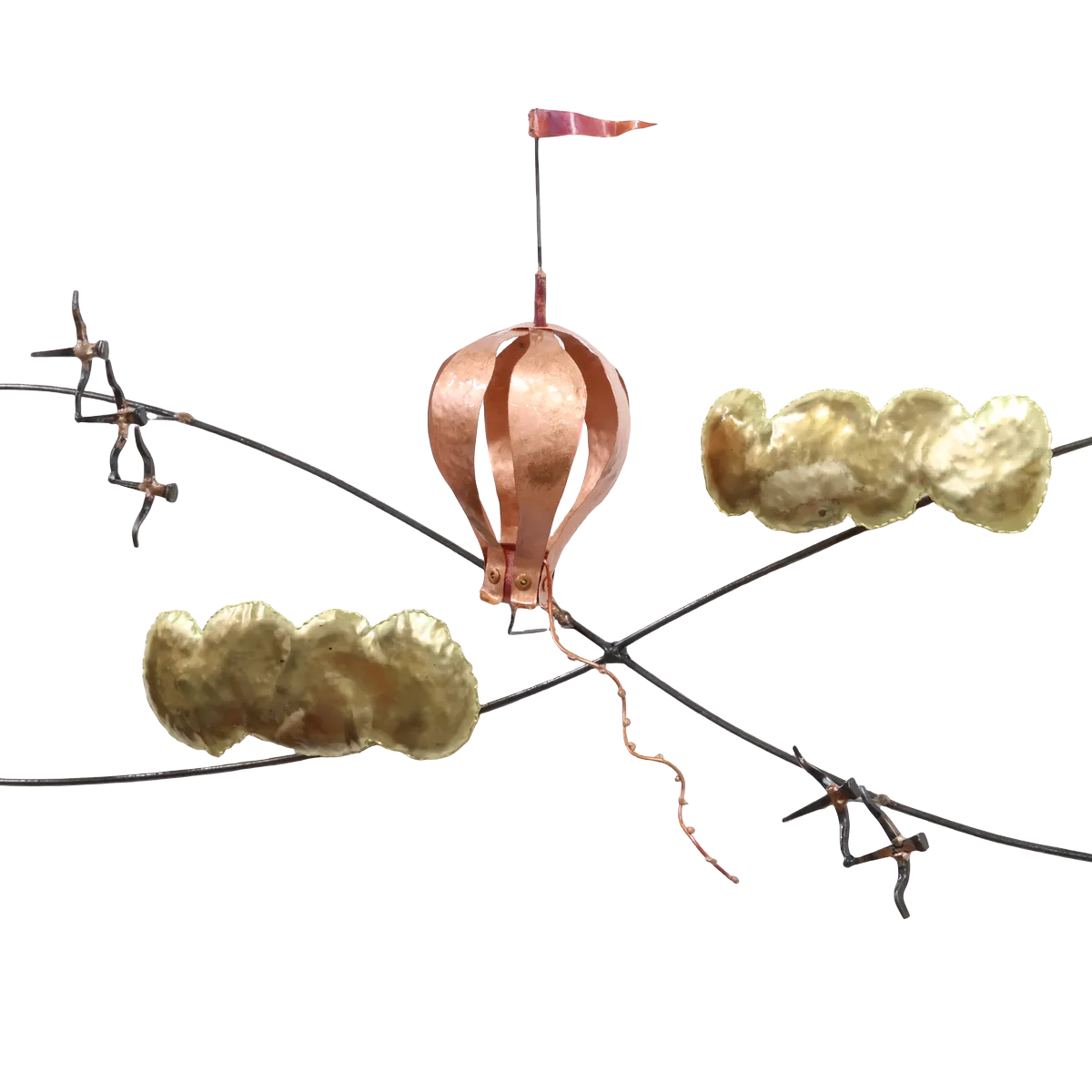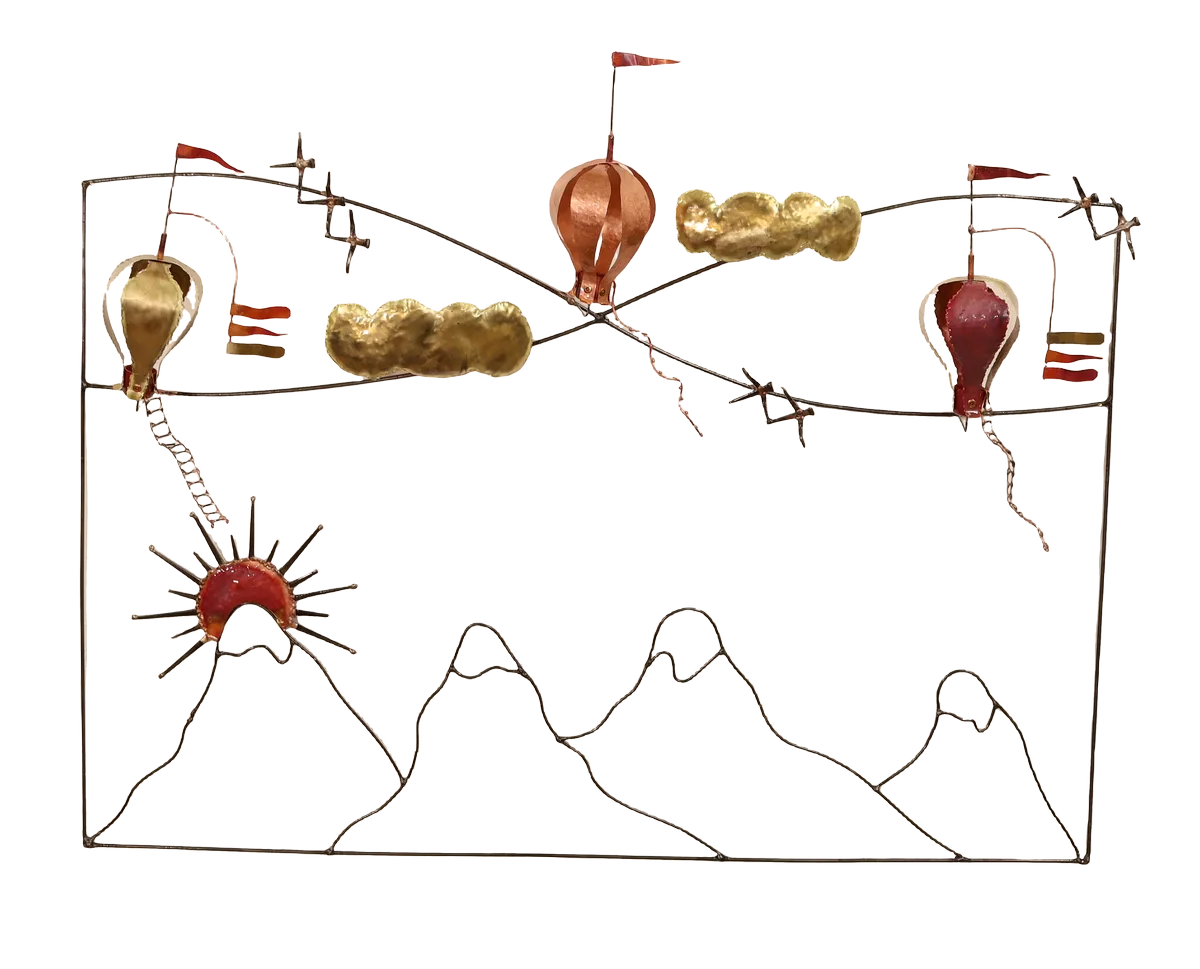 Hot air balloons rising in a snow-capped mountain sunrise are the subject of this framed metal sculpture. For some, this scene symbolizes a peaceful and untethered journey toward a higher purpose. Balloons, ladders, and flags material is copper and brass, the mountains are steel and the sun is copper. The sun rays and birds are made from cut steel nails. This hot air balloon metal sculpture is wall-mounted.