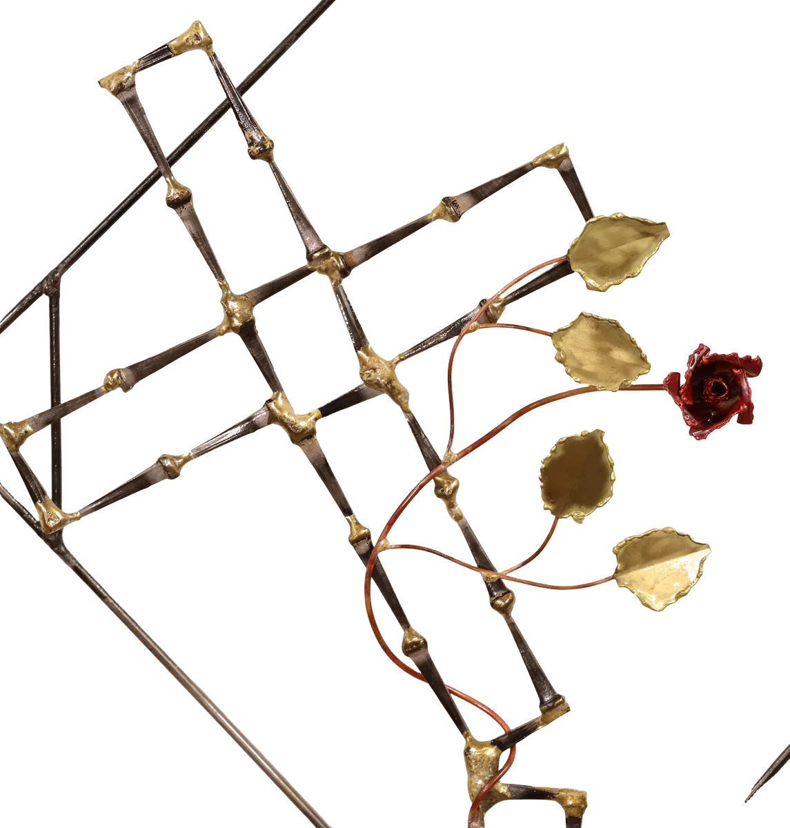 This wall-mounted life after death metal sculpture depicts a broken cross symbolizing Jesus’ death and sacrifice. The intertwined rose vine growing from the break in the cross symbolizes resurrection and life after Jesus’ death. The cross is made of cut steel nails and the rose, vine and leaves made from copper and brass. The religious metal sculpture assembly method is gas welding with steel and bronze.
