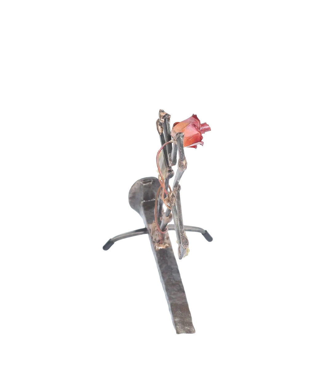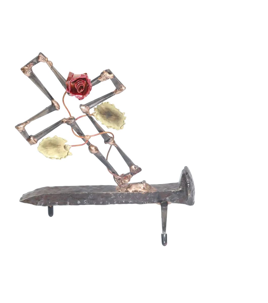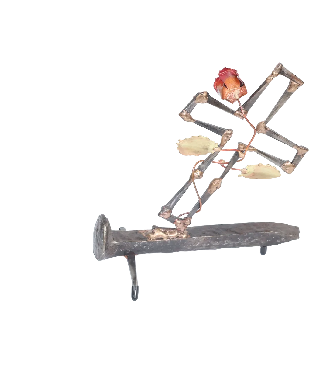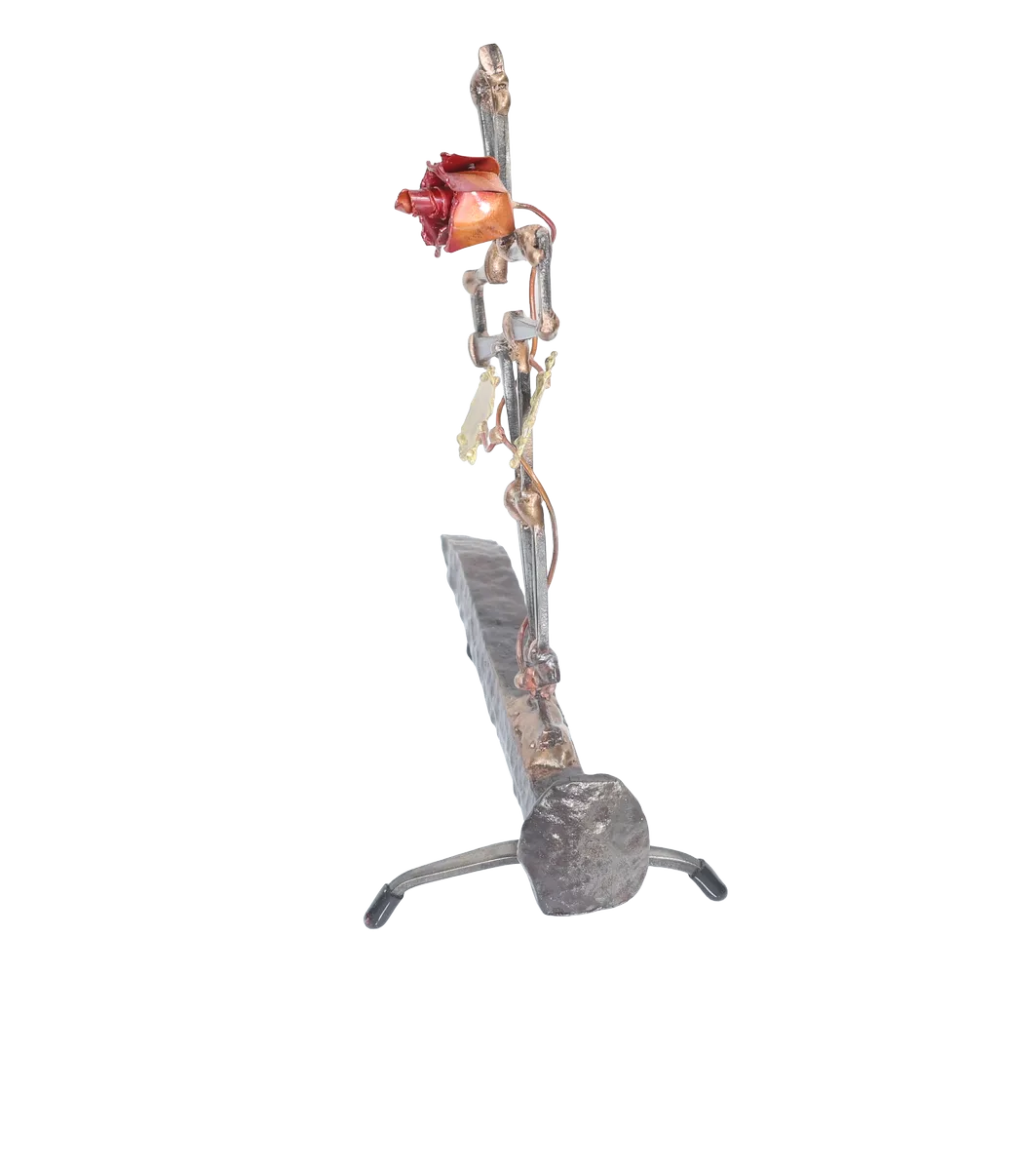 This three-dimensional life after death metal sculpture uses the broken cross and rose growing from the break to symbolize Jesus’ death and sacrifice. The religious metal sculpture base is a distressed railroad spike, which is also symbolic and underscores the need for forgiveness and redemption. The cross is made of cut steel nails and the rose, vine and leave made from copper and brass. The assembly method is gas welding with steel and bronze.