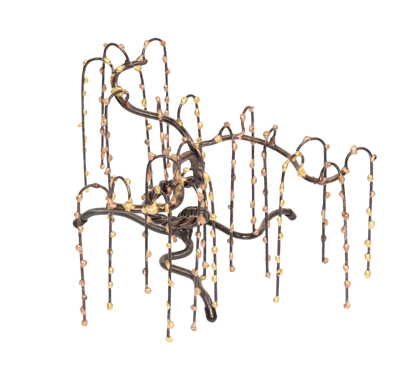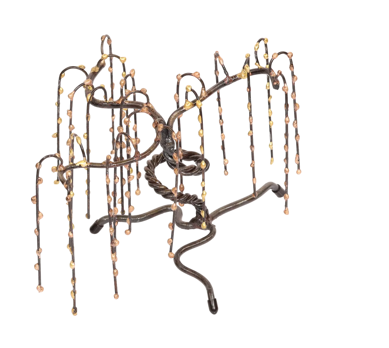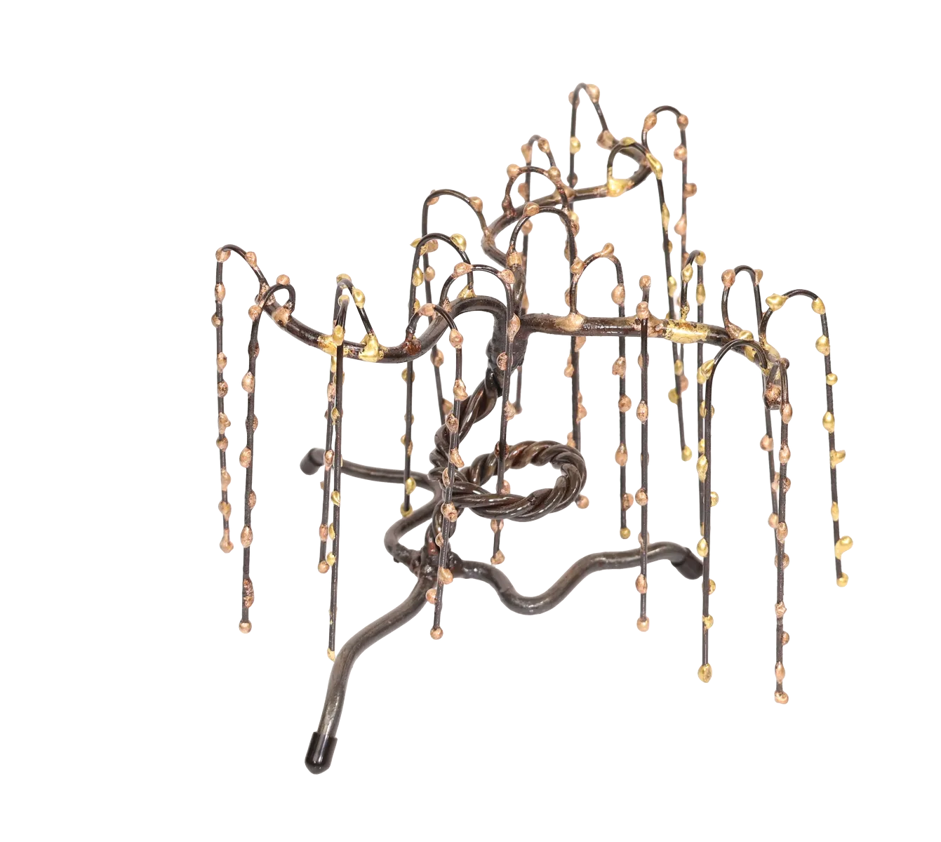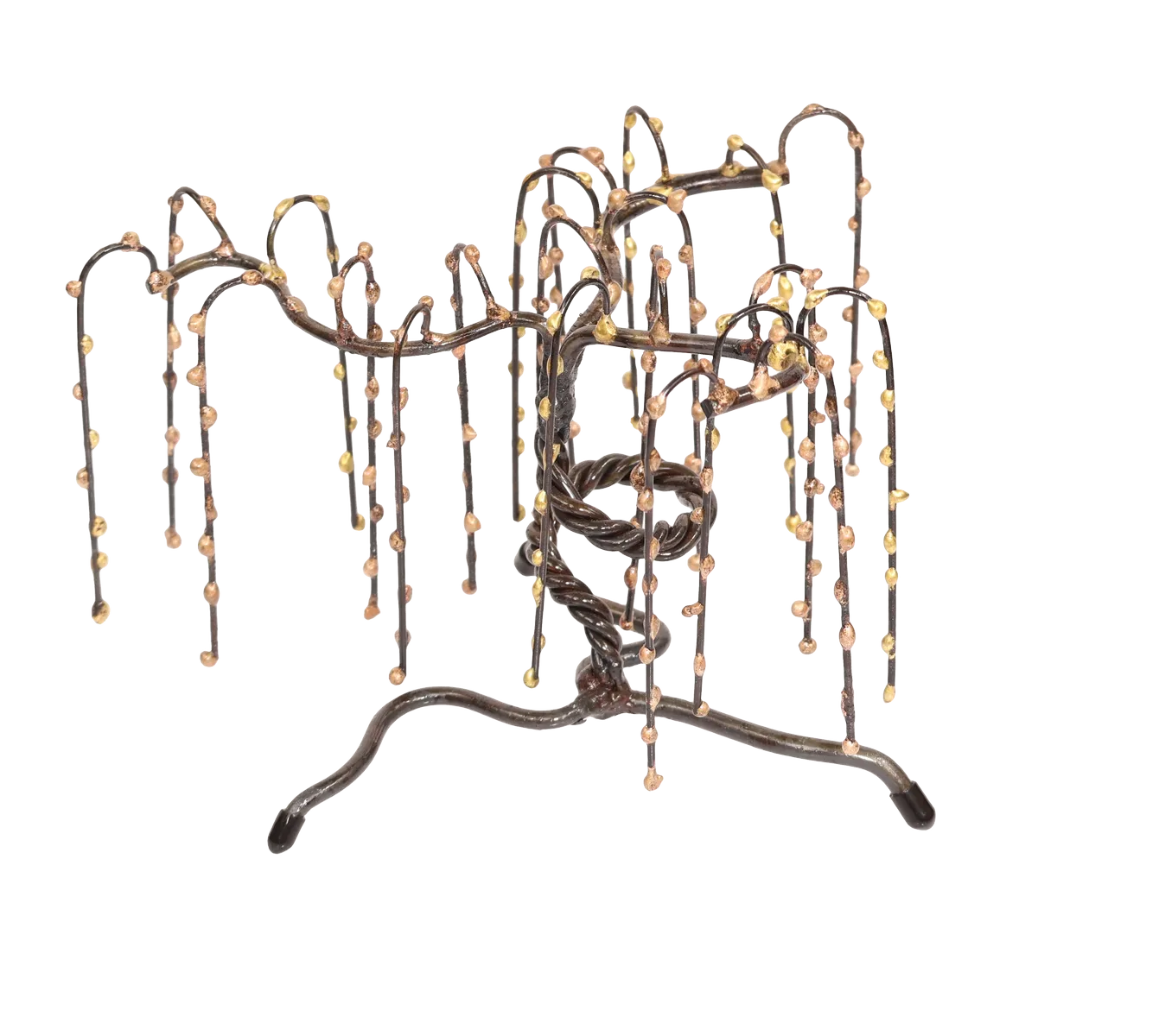 The flexible limbs of this abstract weeping willow metal sculpture represent positivity and the ability to overcome life’s challenges and hardships. The willow is almost entirely made of steel, with the weeping “tears” on the branches being bronze. Protective neoprene covers on the tree feet prevent display surface marring.