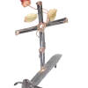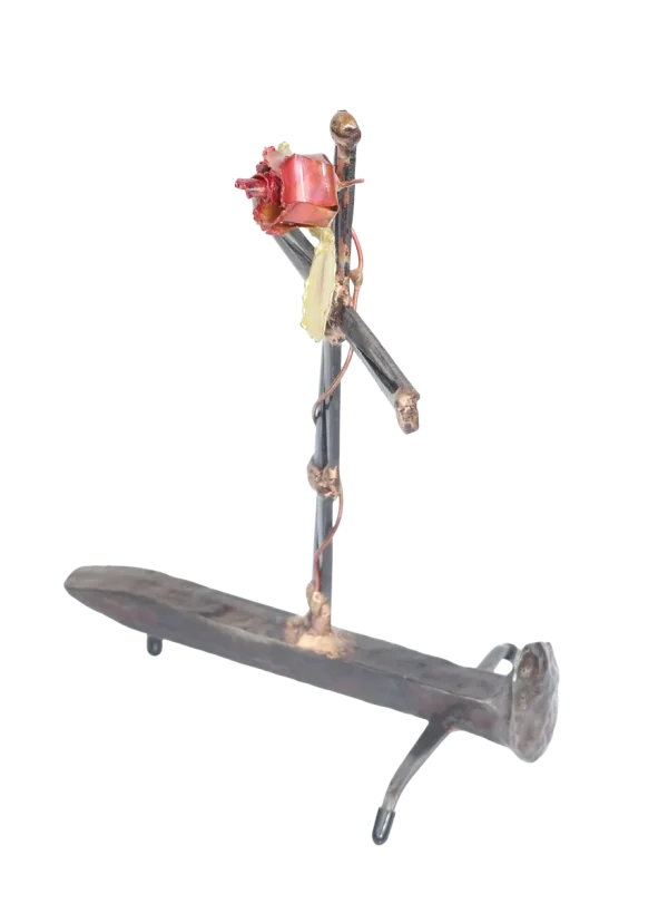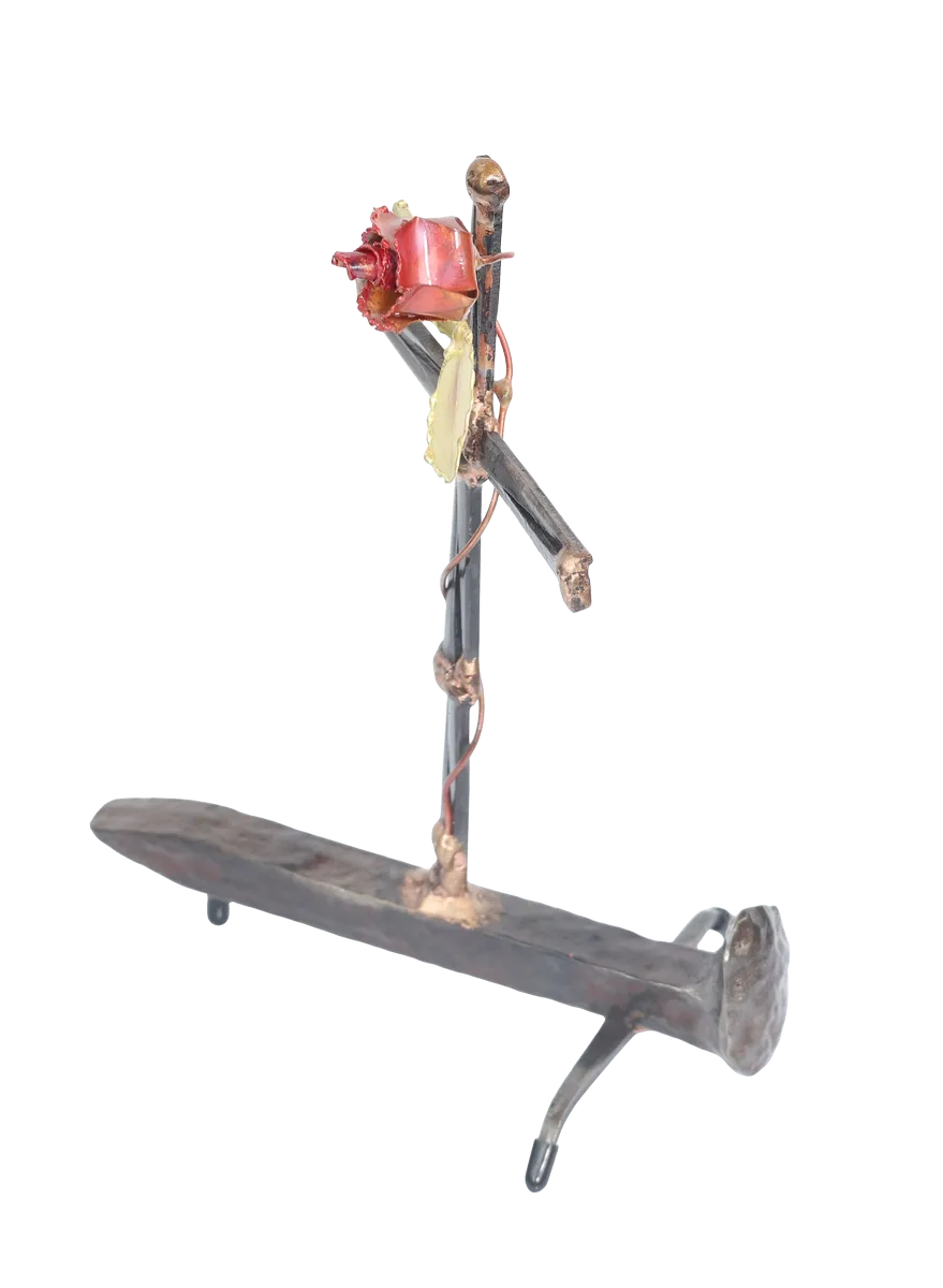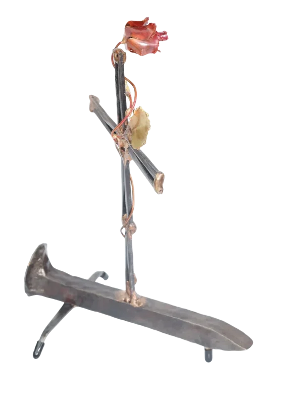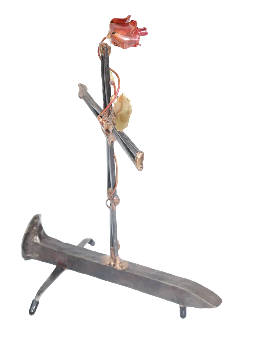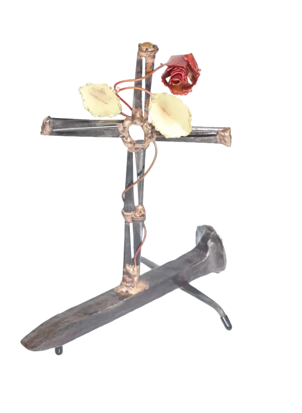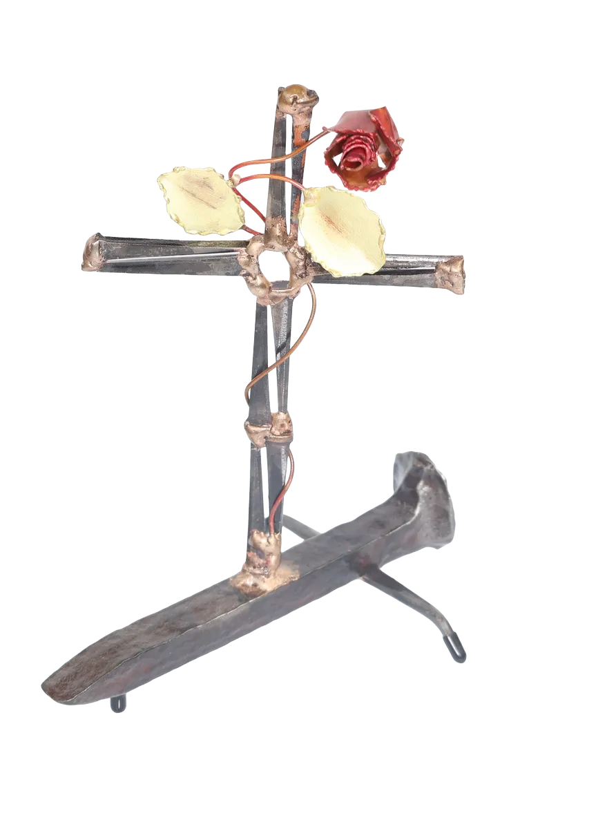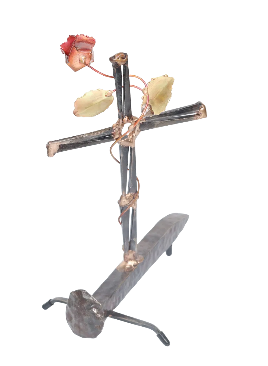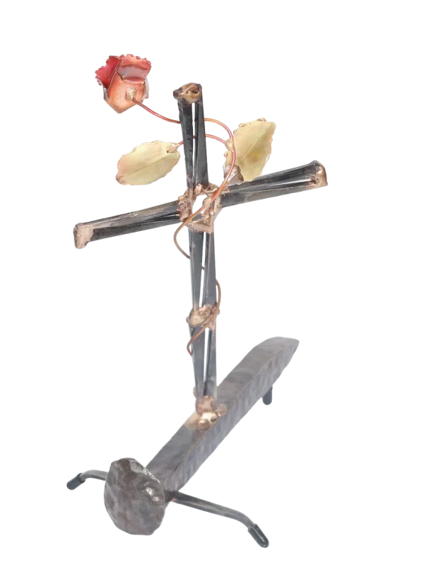 The Cross with rose depicts “flowering of the cross” representing the new life emerging after Jesus’ death. The distressed steel railroad spike base of the sculpture adds additional symbolism of Jesus’ death and sacrifice. Assembly is done with gas welding using steel and bronze.