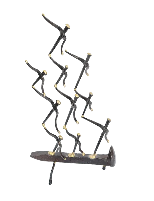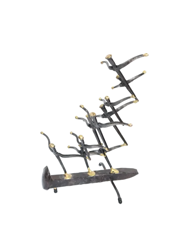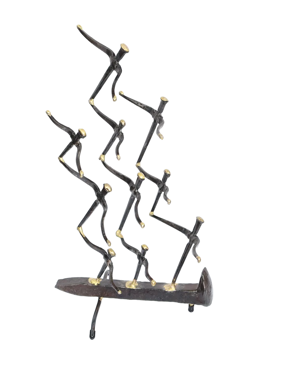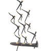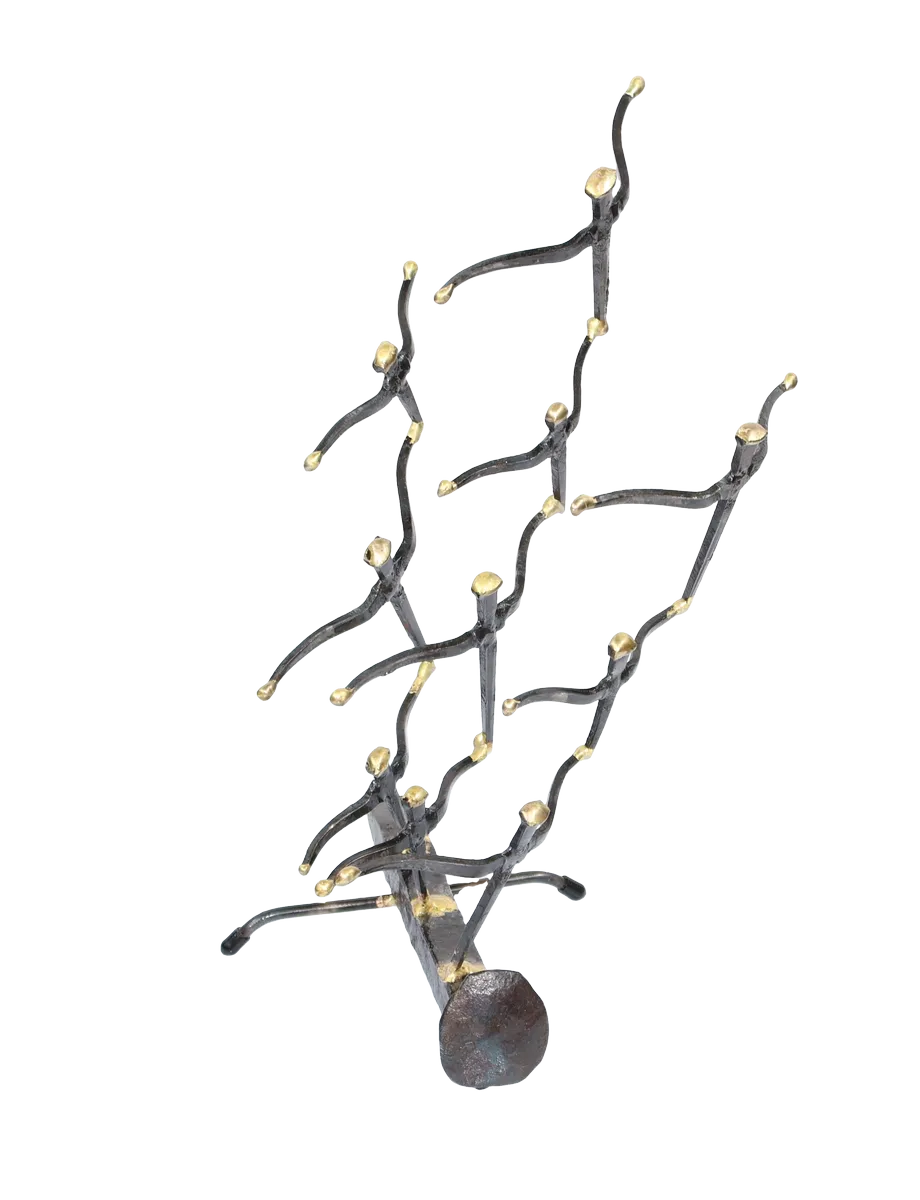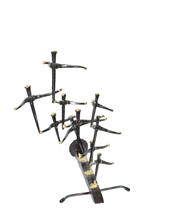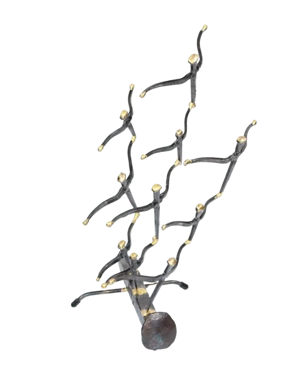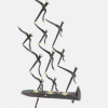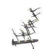 This handmade abstract sculpture depicts a colony of gulls in flight and is designed for display on a flat surface. The gulls are sculpted from cut steel nails and mounted on a distressed railroad spike. Welding is done with steel and bronze. Neoprene covers prevent the spike feet from scarring the display surface.