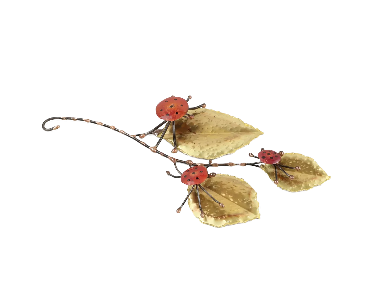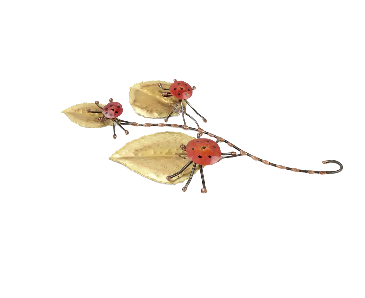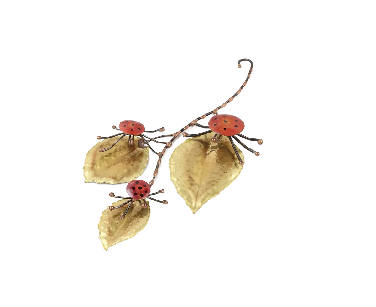 This handmade sculpture depicts three sizes of ladybugs on a leafy branch. The ladybugs backs are pure copper and the legs are steel with bronze accents. The branch is made from steel rod and the leaves are hand-textured brass. This piece is designed for display on a flat surface or hanging on the wall from the curve on one end of the branch or hanging in the opposite direction from a bronze hook provided with the sculpture. The natural theme of this piece will enhance the beauty of any area of your home or office. Fabrication of this piece was done with gas welding and is coated with a durable clear finish.