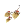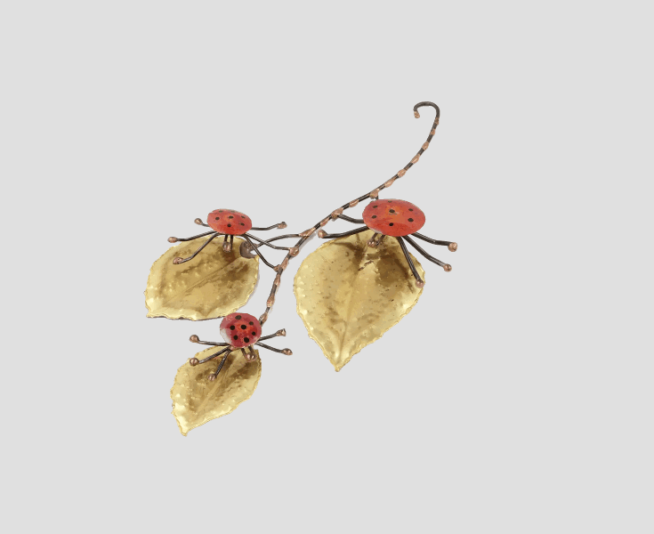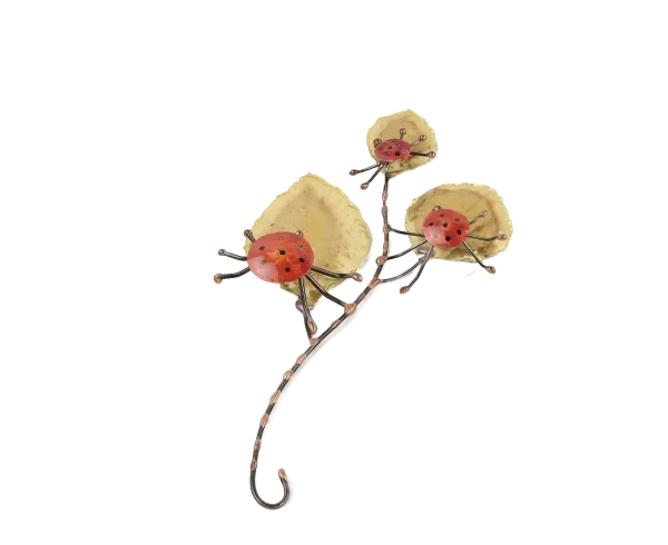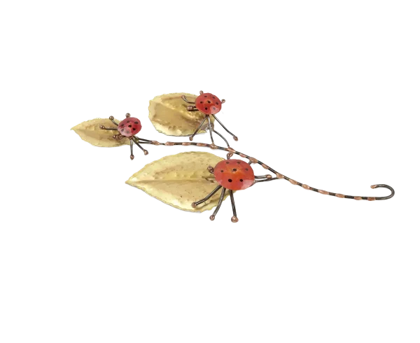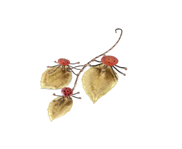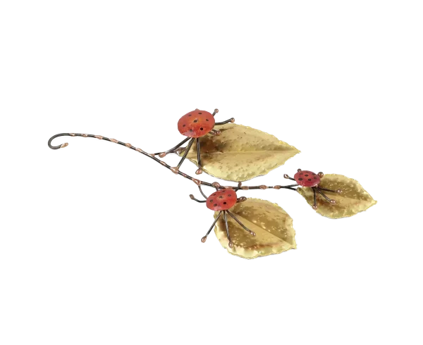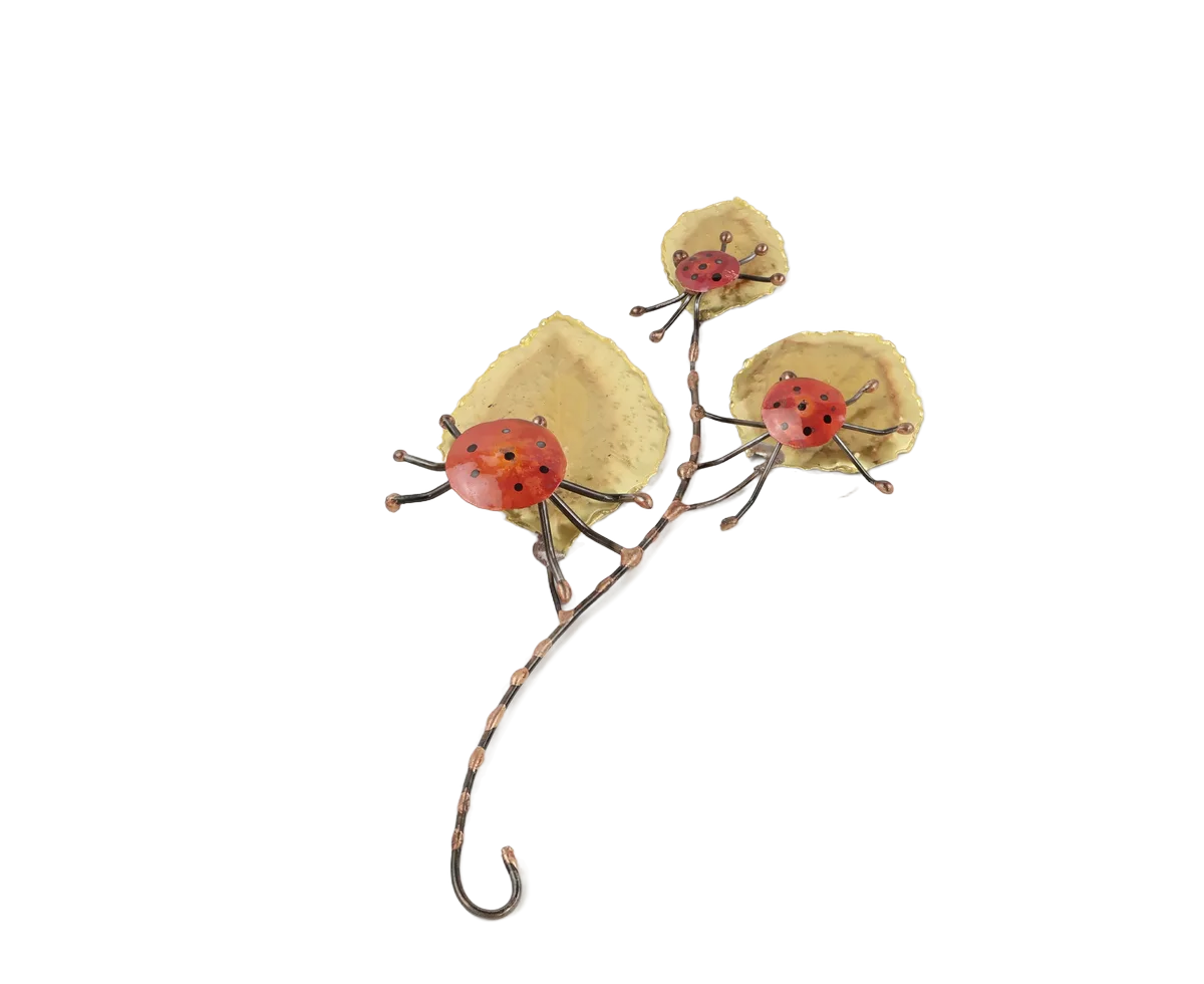 This handmade sculpture depicts three sizes of ladybugs on a leafy branch. The ladybugs backs are pure copper and the legs are steel with bronze accents. The branch is made from steel rod and the leaves are hand-textured brass. This piece is designed for display on a flat surface or hanging on the wall from the curve on one end of the branch or hanging in the opposite direction from a bronze hook provided with the sculpture. The natural theme of this piece will enhance the beauty of any area of your home or office. Fabrication of this piece was done with gas welding and is coated with a durable clear finish.
