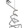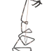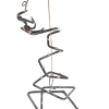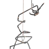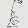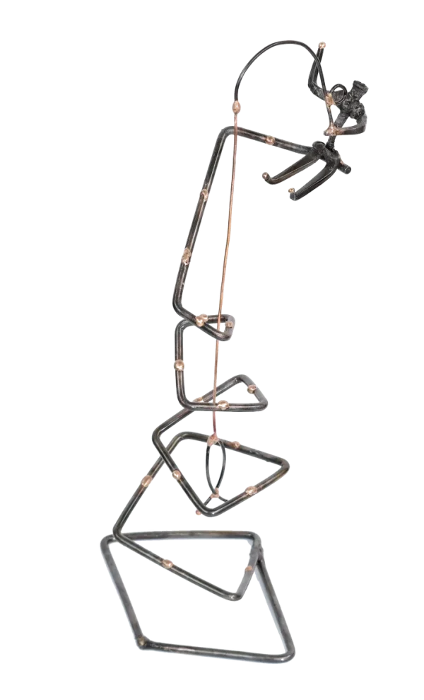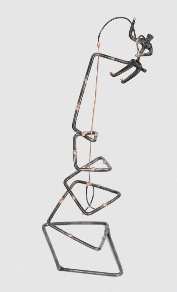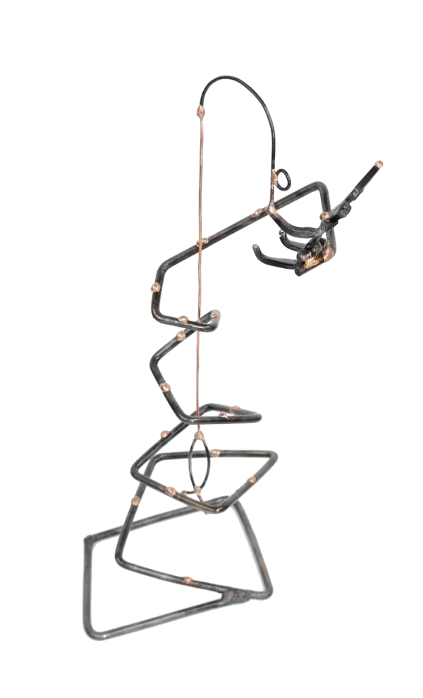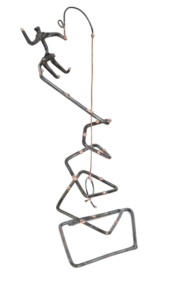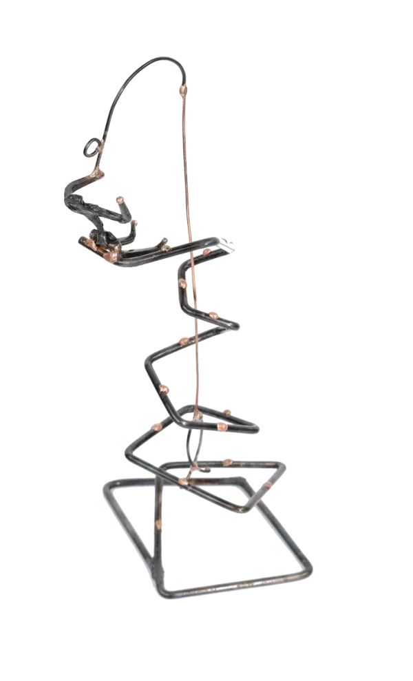 The abstract lone fisherman sculpture is precariously perched atop an ascending geometric base while holding a pole with a fish on the line. The fisherman is made with cut steel nails with the pole made of steel wire and the line is copper. Assembly is with gas welding using steel and bronze.