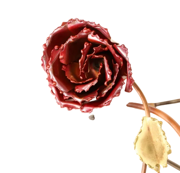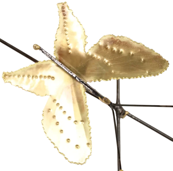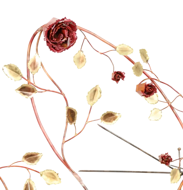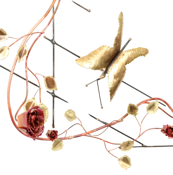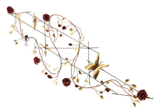 With three sizes of roses, butterflies and a feeding hummingbird, this handmade rose vine décor is an impressive wall accent piece. The roses, vines and stems are made with copper. Rose leaves and butterflies are brass, and the abstract hummingbird is steel wire. All gas welding is done with bronze.